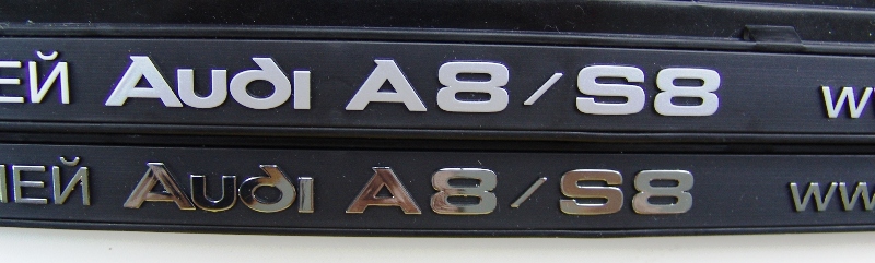 Варианта исполнения рамок - надпись выполнена алюминиевой фольгой. Алюминиевый похож на цвет зеркал S8. Алюминиевый смотрится ярко при любом освещении.