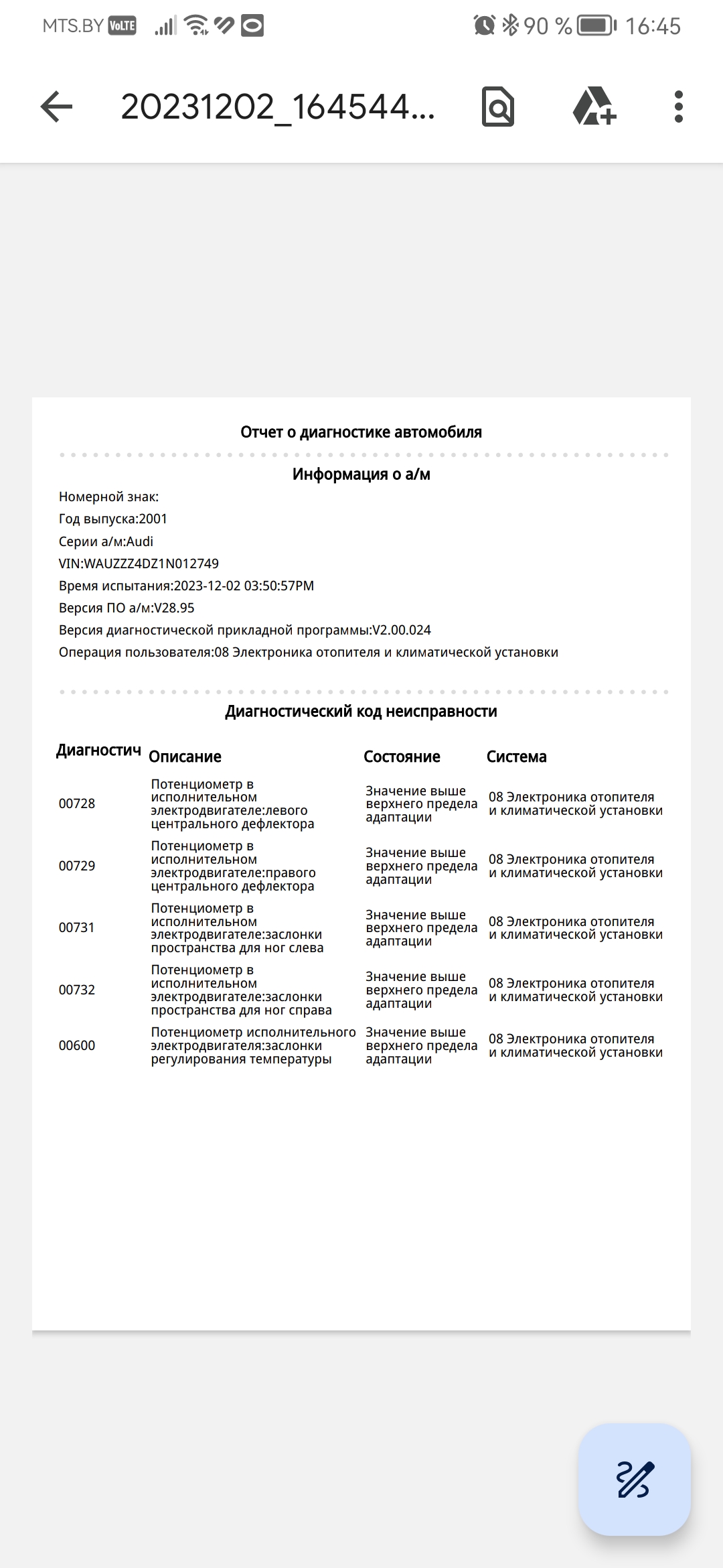 Адрес 08: Электроника отопителя и климата Файл QML: 4D0-820-043-MYX.CLB Номер детали VW/Audi: 4D0 820 043 Q Компонент и/или версия: A8-Klimavollautomat D13 Кодировка: 00083 Код мастерской: WSC 02324 5 Найдены неисправности: 00728 - Потенциометр исполнительного электродвигателя центрального левого де...