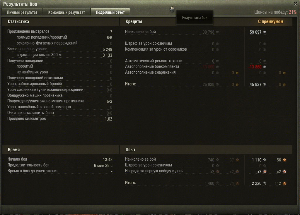 Не смотря на расклады по команде, получился неплохой бой. Тот радостный момент, когда долетает всё, что только можно (первый шот не в счёт :D ).