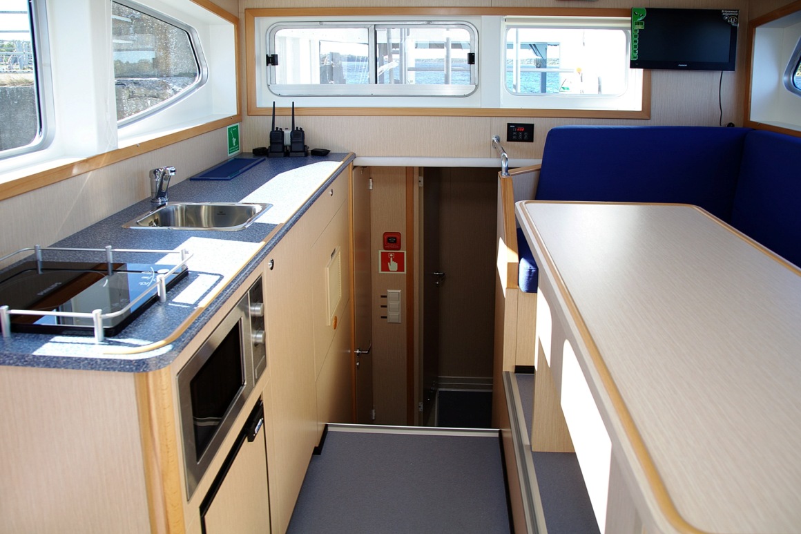 Катер имеет класс "река-море" и может патрулировать как прибрежную морскую зону, так и устья крупных рек. Катер оснащен дополнительным постом управления, что позволяет управлять судном в условиях ограниченной видимости. Объем запаса топлива увеличен до 1,5 тыс. л, что позволяет совершать дальние переходы без дозаправки, до 1000км. На катере есть 2 каюты: носовая и кормовая, которые оборудованы местами для отдыха. Таким образом, ночью на судне могут находиться до 5 человек, а в дневное время до 10. Основные характеристики многоцелевого алюминиевого катера проекта 14М: Длина габаритная 14,5 м, ширина габаритная 4,0 м с привальным брусом. Осадка габаритная от 0,85 до 1,1 м. Катер оснащен подруливающим устройством для для максимально точной швартовки. Оборудован самым современным навигационным оборудованием. Максимальная скорость хода 31 уз. (около 60 км./ч., кажется гораздо больше). Запас пресной воды 200 л. Объем цистерн серых/черных вод — 120 л.