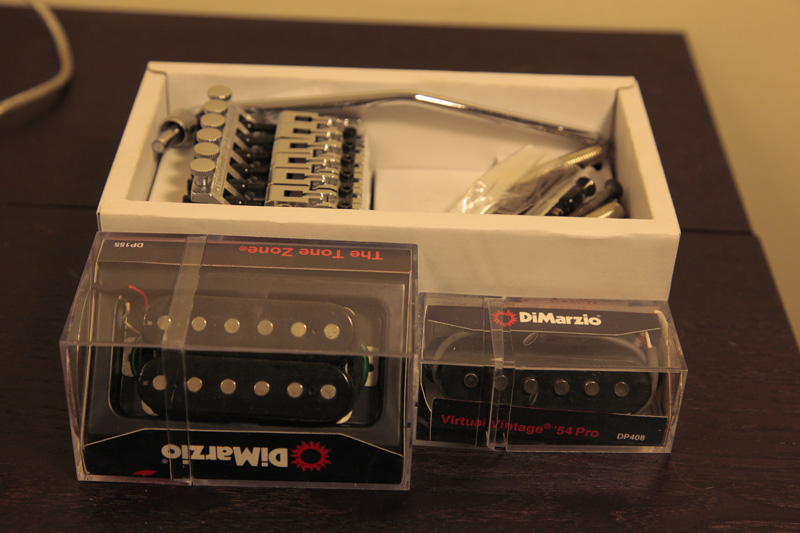 от старой гитары - звукосниматели (не dimarzio - бренд не знаю) и тремоло. Всё рабочее.