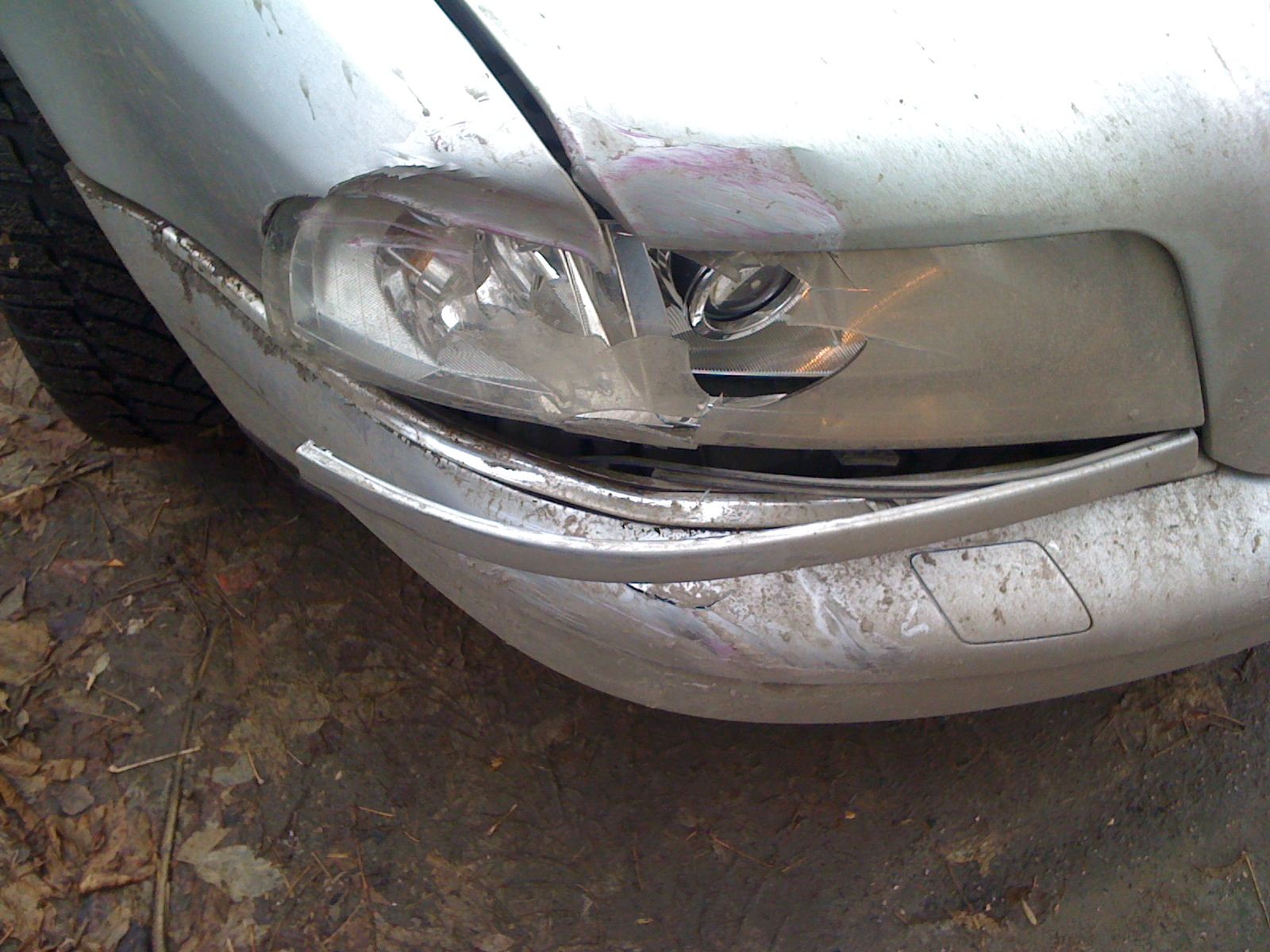 Итог удручющий - багажник исчез практически. Плюс замятина на капоте, переднем крыле и фара вдребезги. Трещина на переднем бампере небольшая. С другой стороны такое же безобразие - надрывы с уголке.
