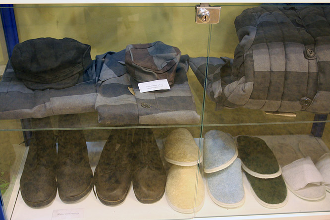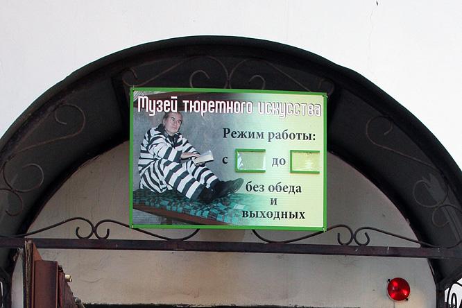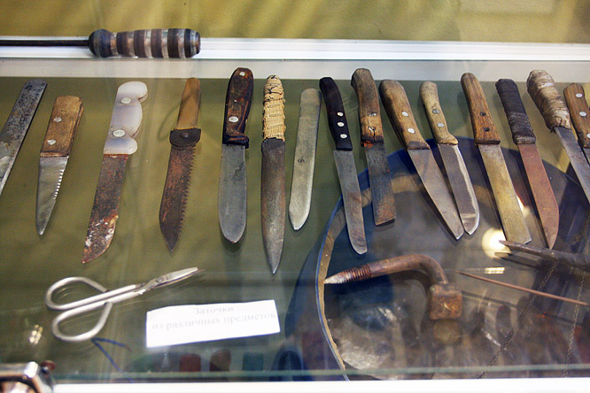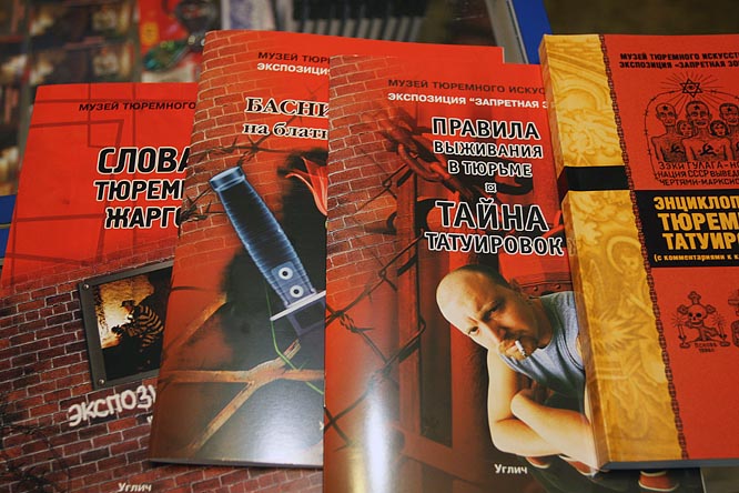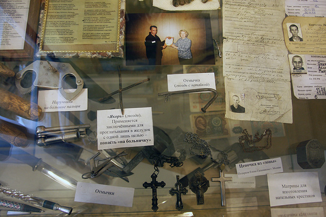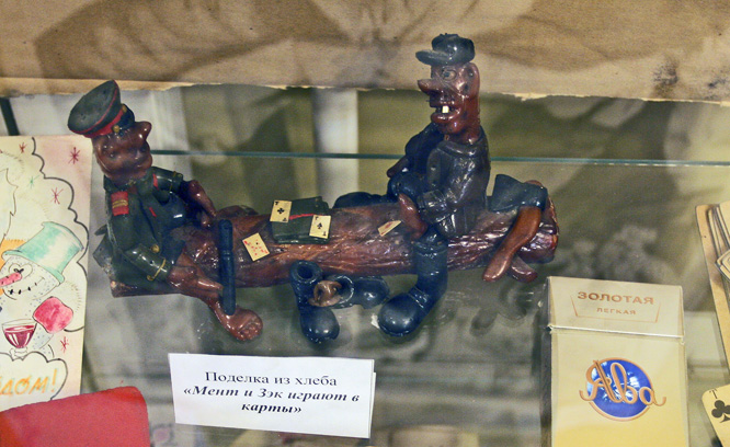тут же сувениры и обучающие пособия для начинающих Дверь в камеру подлинная . Урки -манекены имеют вид задумчиво- интеллигентный . С урками предлагается сфотографироваться в обнимку.