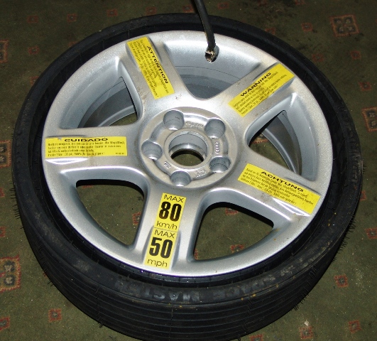 Первый раз такую увидел, интересное решение проблемы размера запасного колеса. Ставилось на Audi Allroad. Внутри запаски лежит компрессор для накачки.