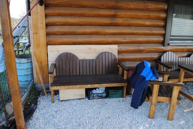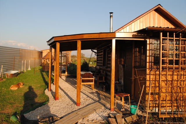 Это вид пристройки к бане и навесу с поликарбонатом.и диванчик.