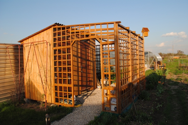 Вот допустим декоративный колодец над кранами подачи воды на участок.и маленький сарайчик для хозинвентаря с решетками для плетущихся растений.
