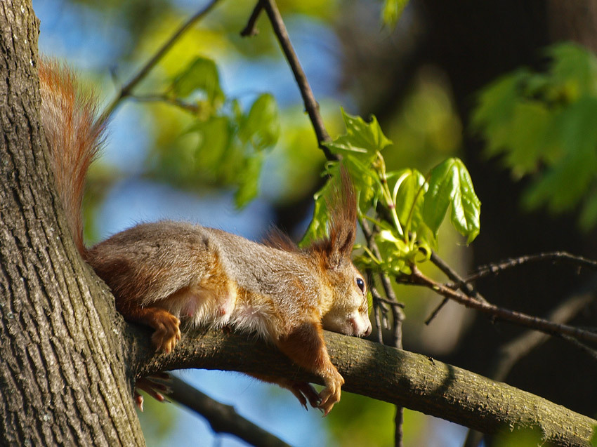Смешное фото №2, сразу видно, что переела маленько! У меня тоже такое бывает (переедание), правда, отдыхаю не на ветке. А вообще это мама-белка (или готовится ей стать).