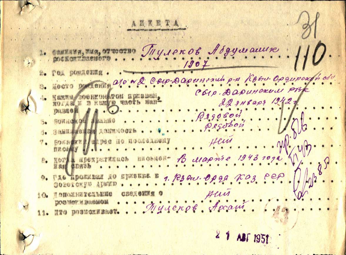 Привет одноклубники! Скоро юбилейная дата и праздновать наверное будут многие государства, парад в честь дня победы и т.д... Так вот, обращаюсь к Вам, может есть у кого знакомые в центральном архиве мин.обороны РФ, который базируется в подольске, ну может кто то из наших от туда?! Дело в том что мой родной дед вернулся, а вот его старший брат увы пропал без вести - красноармеец Тулеков Абдумалик Ахетович, призван кызылординским военкоматом казсср. Я писал письма в мин.обороны РФ, объяснил ситуацию и мне ответили что он служил, то ли имел какое то отношение к полку летному "ночные ведьмы", который на момент, когда пропал дед базировался на украинев одесской области и все, больше ни чего нет. Мол приезжайте в подольск, и изите дальше в архиве... Кто что скажет, и кто чем сможет помочь, может есть знакомые в поисковых отрядах, в мин.обороны, в центральном архиве в подольске и т.д. На сайтах был, подвиг народа и еще какойто поисковик уже не помню, он там есть, но пишут, что просто числится, как пропавший без вести! Хотелось бы узнать о его военной судьбе более подробнее: где именно служил, как погиб и где захоронен, что бы перезахоронить на родине, как полагается!