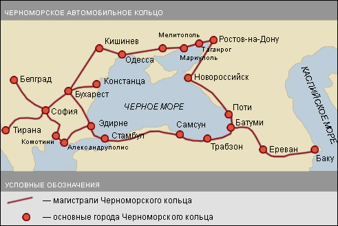 кольцевая автодорога вокруг черного моря - основной маршрут HWBSR пройдет через Стамбул (Турция) – Самсун (Турция) – Трабзон (Турция) – Батуми (Грузия) – Поти (Грузия) – Новороссийск (Россия) – Ростов-на-Дону (Россия) – Таганрог (Россия) – Мариуполь (Украина) – Мелитополь (Украина) – Одесса (Украина) – Кишинев (Молдавия) – Бухарест (Румыния) – Хасково (Болгария) — Комотини (Греция) – Александруполис (Греция).