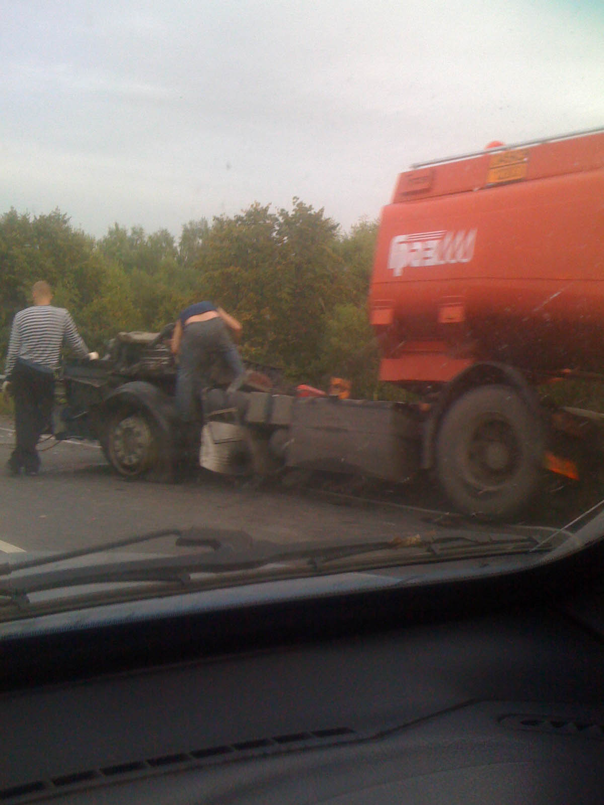 Бензавоз,буквально висит на мосту,еще децл и рухнет в речку.