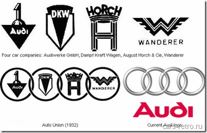 Четыре кольца на эмблеме "Ауди" означают слияние 4 компаний - "Ауди Верке", "Аугуст Хорьх Аутомобил Верке", ДКВ и "Вандерер" в 1934 году. Поначалу логотип Ауди использовался только на гоночных машинах, простые же автомобили каждая компания производила под своим брендом и украшала србственными эмблемами. На иллюстрации представлены логотипы каждой из объеденившихся компаний. В 1964 году Volkswagen купил Audi, но логотип остался прежним.
