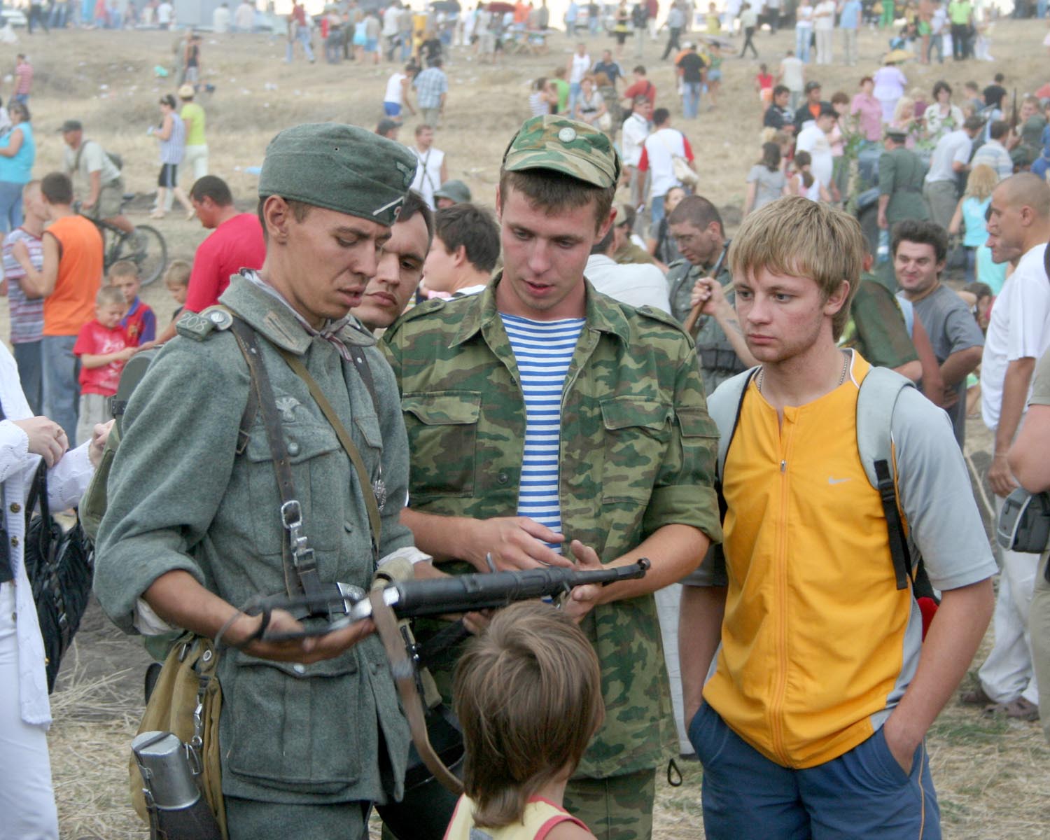 в честь годовщины освобождения родного города Таганрога была устроена реконструкция освободительной битвы, имевшей место в этих местах 65 лет назад - танки немецкие, самоходка русская, немецкие солдаты и красноармейцы, казаки на конях..ружья и пушки , автоматы, сабли и лопатки у казаков. Учебные самолеты со звездами демонстрировали превосходство над учебным самолетом с крестом, знать немецко-фашистским, был даже парашютист со со сбитого немецкого самолета.