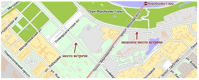 В случае невозможности там припарковаться (так изредка бывает при проводимых на территории МГУ мероприятиях, вроде на день встречи ничего не планируется), есть запасное место встречи - не доезжая 300м до гостиницы Орленок, по Косыгина, напротив Дворца Пионеров. Оба места встречи указаны на карте, так что тем, кто едет в первый раз, лучше карту распечатать.