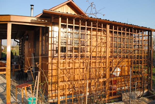 Вот допустим декоративный колодец над кранами подачи воды на участок.и маленький сарайчик для хозинвентаря с решетками для плетущихся растений.
