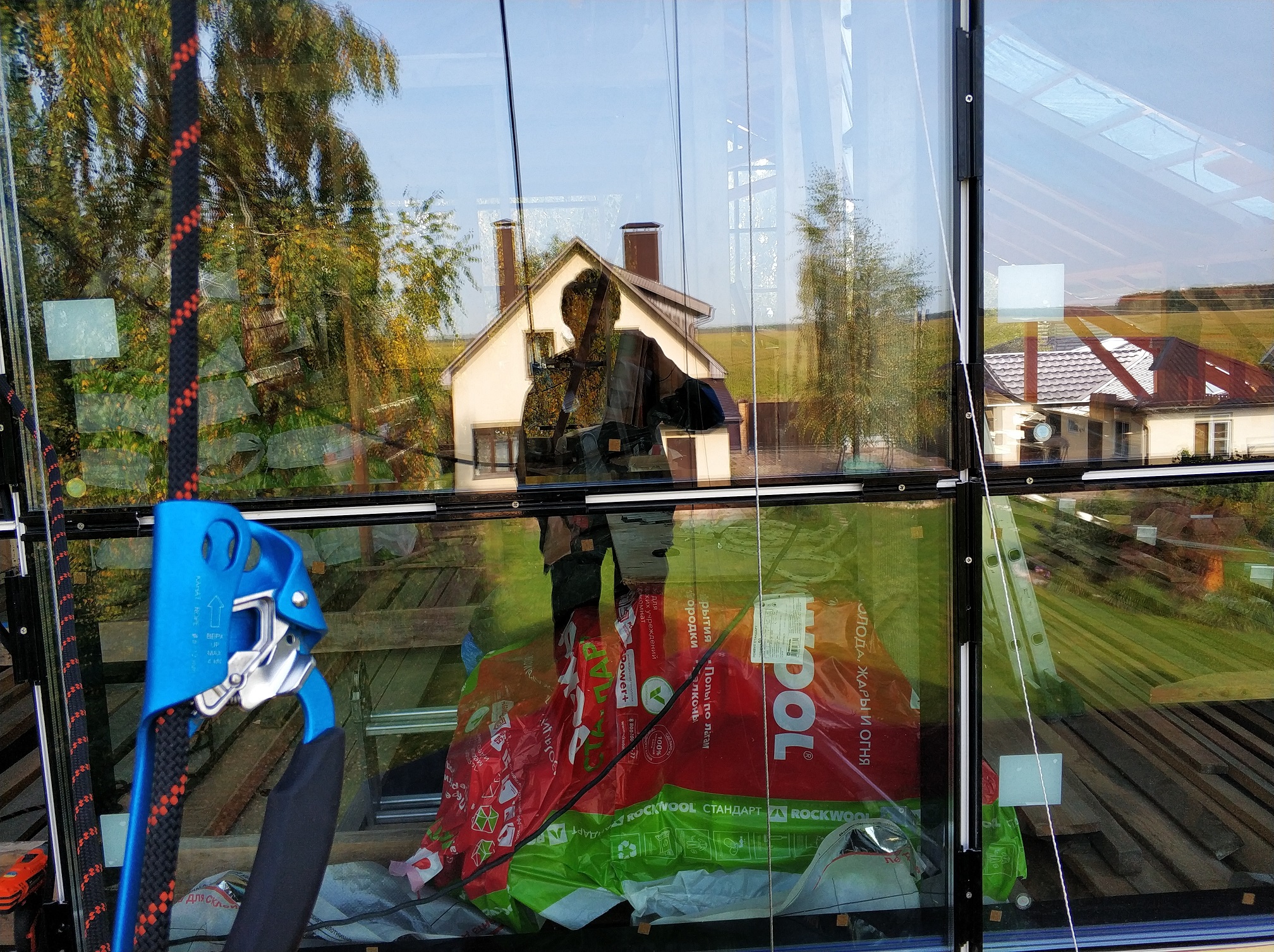 Жму кнопочку на пульте, оттягиваю веревками в нужном направлении, почти как на воздушном шаре и стеклопакет медленно но верно движется к намеченной цели. А, да, ещё есть один элемент. Важный. Конструкция, которая крепится под крышей, на ней ролики и именно она несёт всю основную нагрузку.