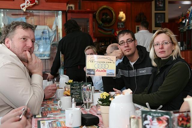 Итак, суббота, 11.00, я уже поспав после работы, быстренько под душ. Ещё немного кофею и вперёд, друзья ждут.Быстрая перекличка: я, жена, трое дочек и новый член семьи чивава Scotty, все готовы. Выезд из дома в 11.30, температура за бортом -11С°, 5 минут позже на борту приятные 23С°.На дорогах лежит снег, ничего страшного: Quattro уже радуется, а папа за рулём ещё больше. 11.43 подъезжаем на стоянку недалеко от Брауншщейга, где нас уже ждёт Рене с дисками. Диски быстро поменяли местонахождение из его в мой багажник. И опять полный вперёд, так как обещал 13.00 быть в Магдебурге. Выехав на Автобан 2 и проехав едва ли 20км - давка, стоим 1,5 часа. Звоню Райко и докладываю, что приеду немного позже. Доволен остался только Scotty, счастливец погулял со мной между машин и.....пописил. Спустя 40 минут съезжаем с Автобана в сторону Магдебурга, и в городе попадаем опять в давку, а нам надо в ещё 4км дальше в Пехау, это сразу за городом. Созвонился с Райко, он объяснил, что впереди авария, в которой погибли два человека. Развернулись и, проехав 30 лишних километров, наконец, прибыли, 3,5 часа и 132км после выезда из дома.