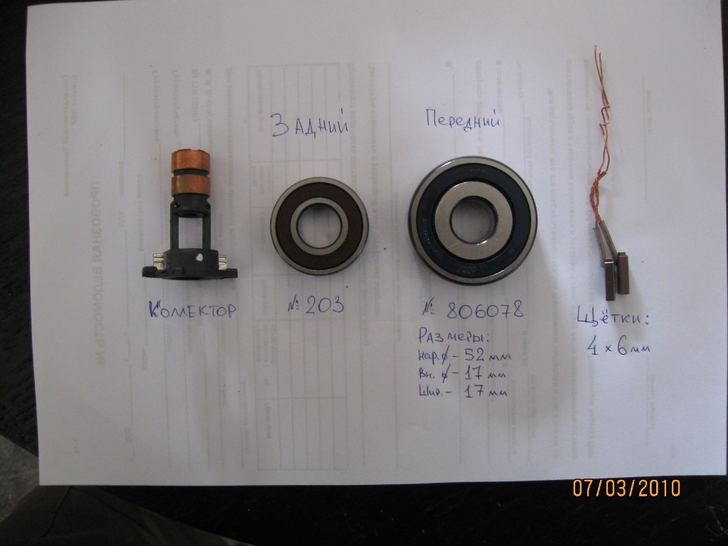 Коллектор генератора"Bosch"(но в магазинах бывает 2-3 вида,желательно образец),подшипники:Передний-52*17*17мм(размер,т.к.номера разные бывают);Задний-203;Щётки-6*4мм.ChelseaFC писал(а):А от чего ставил?Евгений В. писал(а):Мне меняли за 600 рублей.