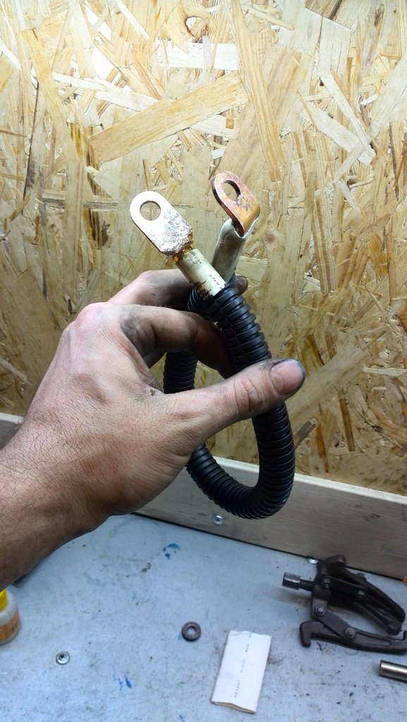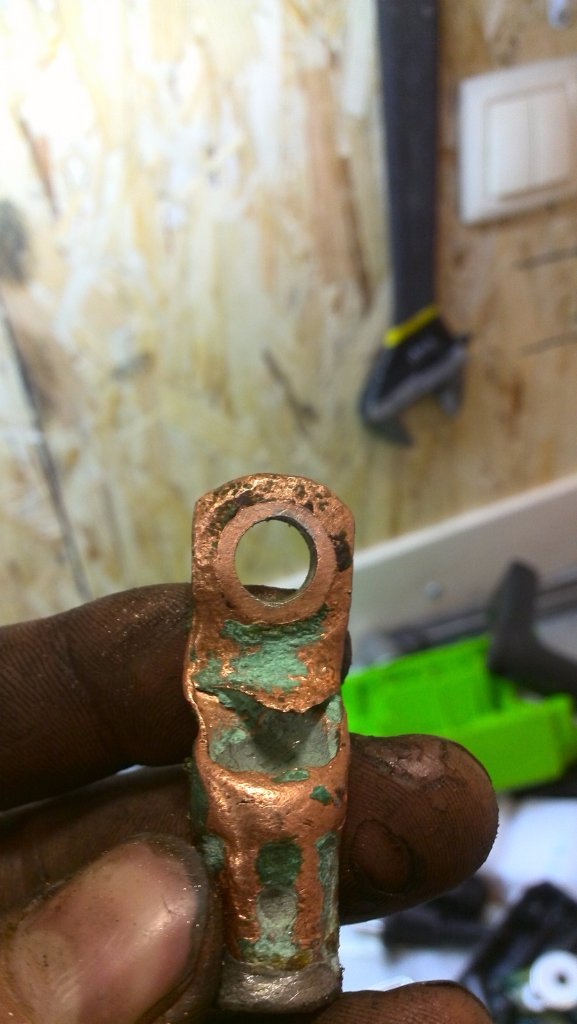 отмеряем, отрезаем, в клемму наливаем немного паяльной кислоты, вставляем кг в клемму и разогревая газовой горелкой добавляем туда припой пока он через край не закапает. Потом когда немножко остыл - приплющиваем молотком.
