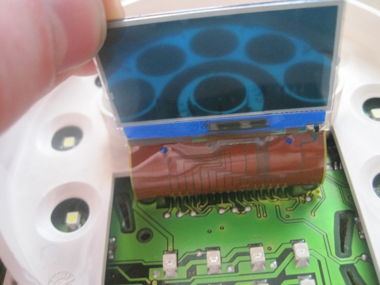 чип виден будет если отодрать синюю наклейку, с левой, вроде, стороны. Я так понимаю - это драйвер дисплея - получает цифровой сигнал на отображение и конвертирует его в подсветку конкретных элементов экрана... а так дисплей перепаять проблем быть не должно