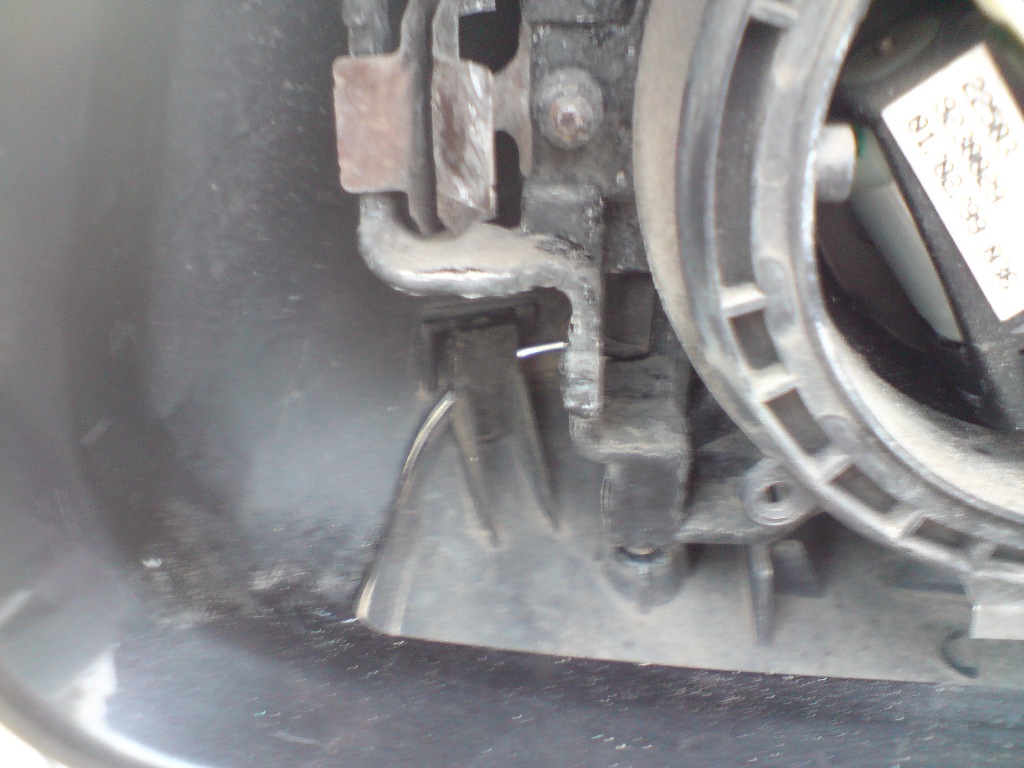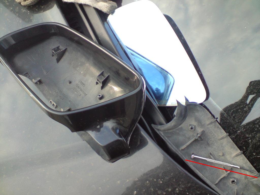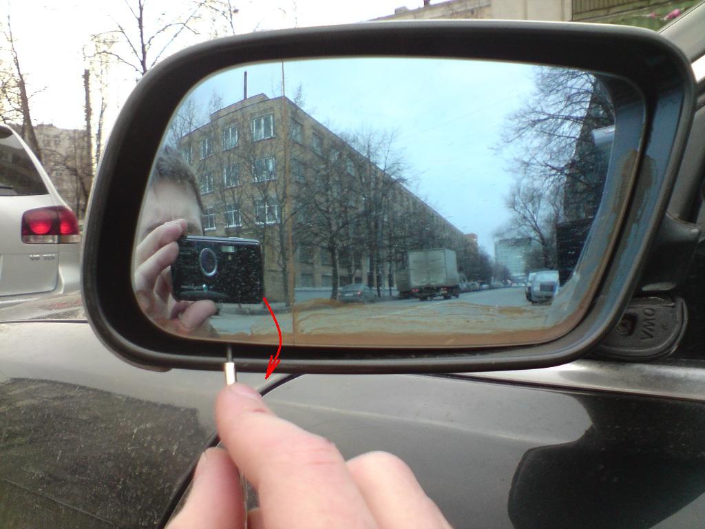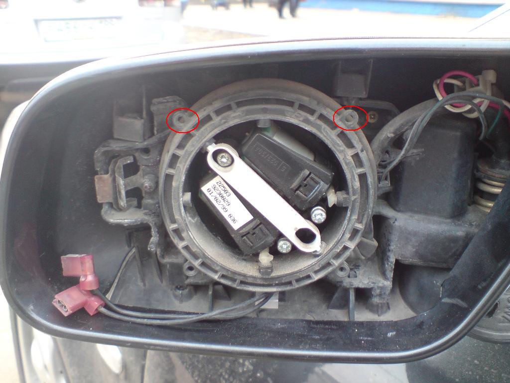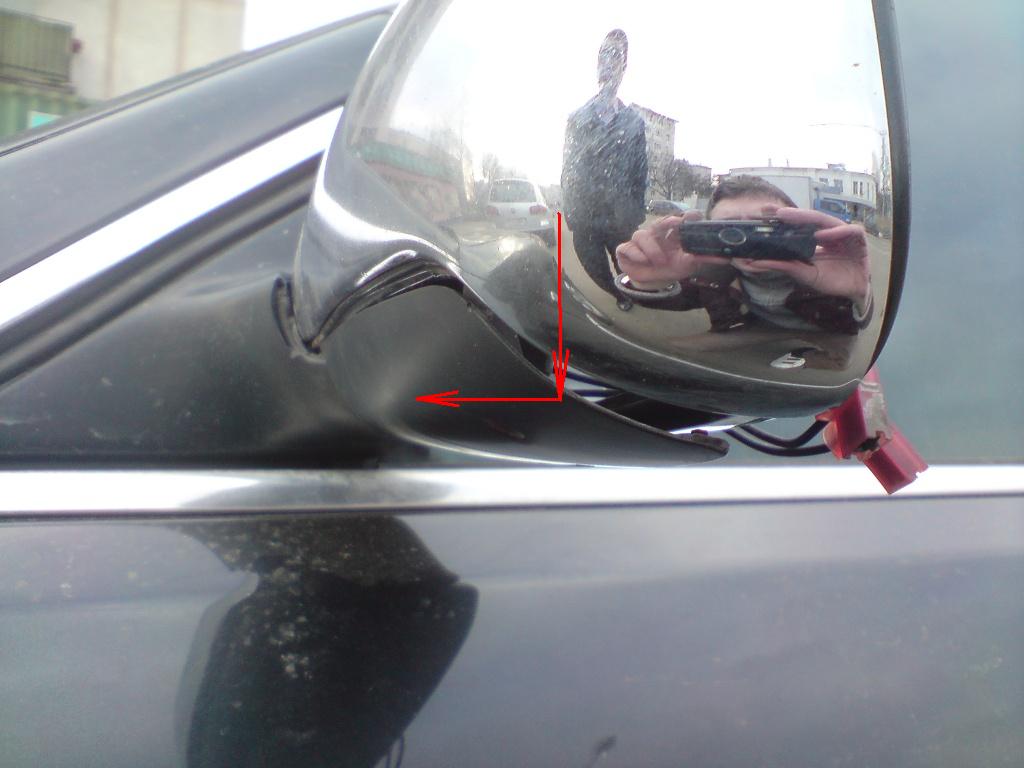 Итак, зазор максимален, что же там нужно разглядеть!? А увидеть нужно две… ”петельки”, если хотите, через зазор они легко проглядываются. Для понимания дела они показаны на фото ниже, уже после того, как зеркало снято.