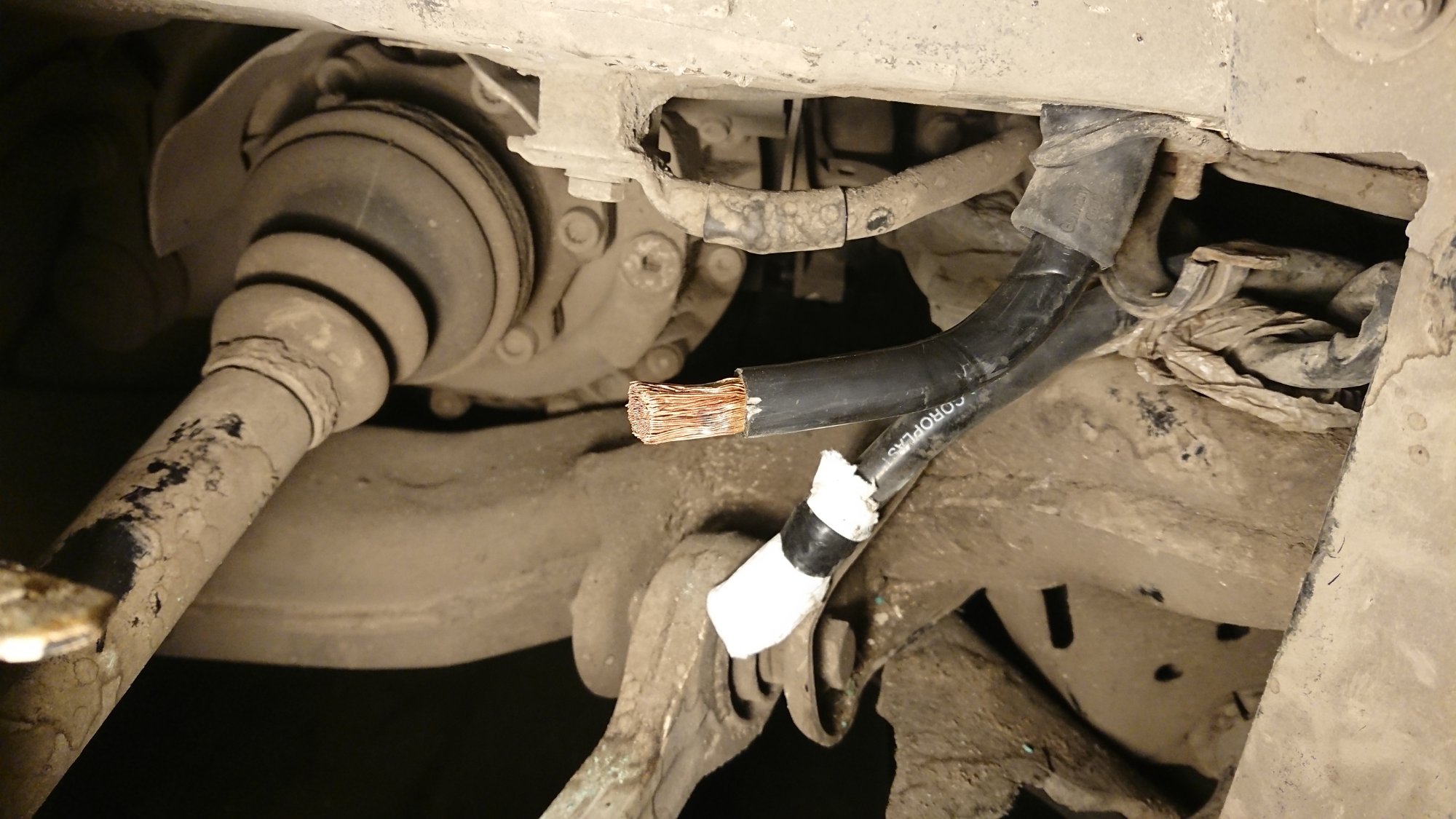 Снимаем правое колесо: Видим, во что превратилось клеммное соединение: Удаляем старую клеевую термоусадку и оставшуюся часть наконечника, аккуратно надрезав наконечник болгаркой, не касаясь жилы, (не потеряв ни одной проволочки!).