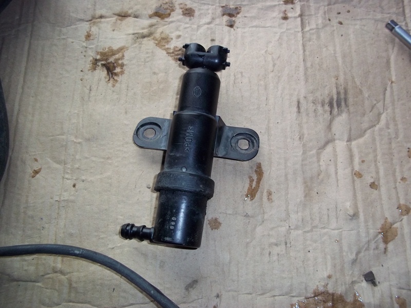 Когда я купил машину,омыватель фар небыл подключен,подключив одна форсунка поднималась но небрызкала.Сняв саму форсунку,в ней обнаружил какой то шарик белый,который мешал проходить омывающей жидкости.Вытащив постороний(так казалось на то время) предмет,обе форсунки стали брызгать исправно.Течи сразу незаметил,на следующий день даванул мороз и вся жидкость вылелась.Я подумал выдавило из-за того что непрогнал воду,т.к. проверял работоспособность водой,а потом залил незамерзайку.Вобщем нестал тогда разбираться и просто отключил омыватели фар,только сейчас дошли руки до них.Пока был снят бампер,решил посмотреть в чём проблема течи омывателя.