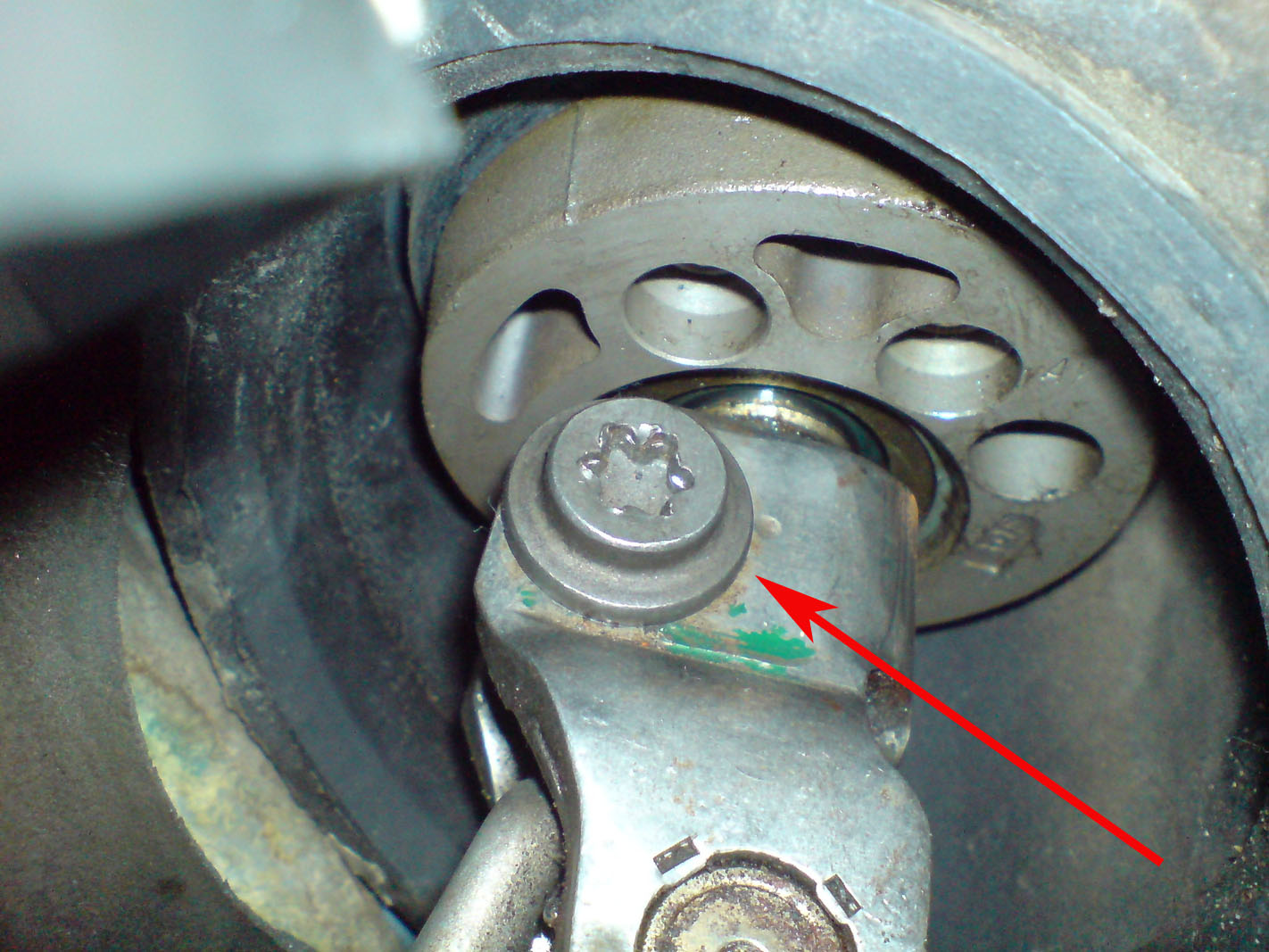 Прежде чем снимать - помечаем маркером положение вала относительно рулевой колонки .Отворачиваем болт крепления рулевого вала от рулевой рейки . Сначала отворачиваем гайку(ключ на 15) - потом поворачиваем болт (он сделан эксцентриком) и вытаскиваем его