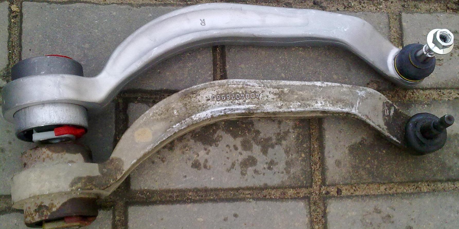 Разболтался шарнир в заднем нижнем рычаге передней подвески. Рычаг был по ходу оригинальный, с эмблемой ауди, номерок вот: