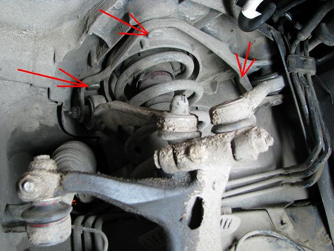 Поддомкрачиваем перед, снимаем колесо, передний подкрылок, опираем на подставку ступицу, и опускаем домкрат. Пружина сжалась, доступ к ней свободен, одеваем стяжку пружины и выбираем зазор. Поднимаем домкрат. Затем откручиваем верхние рычаги по стрелкам, наконечник рулевой тяги (верхние менял поездкой ранее, фото сделано чуть позже, без стяжки)