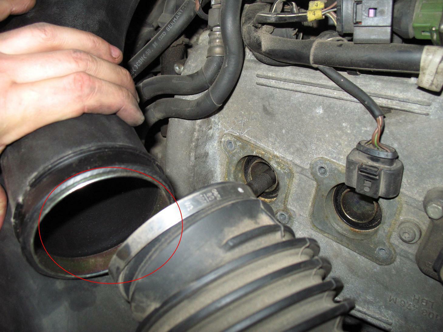 С правой стороны двигателя для доступа к двум катушкам зажигания и свечным колодцам необходимо ослабить металлическое крепление (хомут) воздуховода, после чего появляется место для маневра ключами для снятия катушек и свечей зажигания.