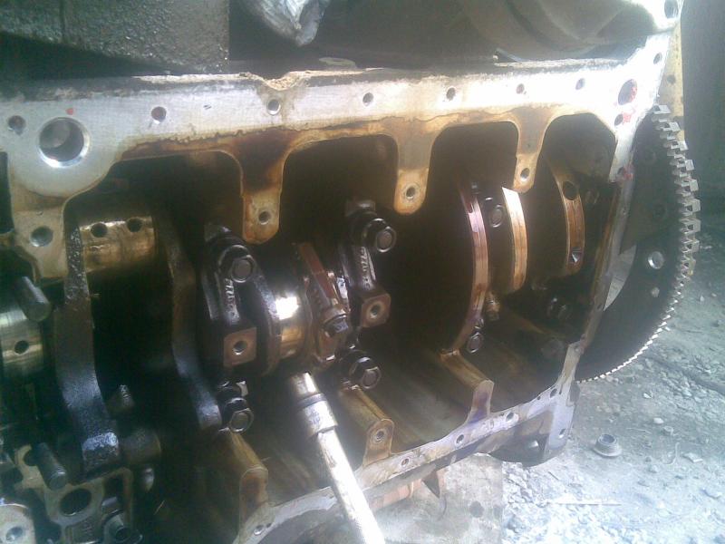 с валом засада на 7 цилиндре провернуло вкладыши а на остальных потрепало, причиной всему стало разжеванная масленым насосом и пропущенная по валу латунная шайба устанавливающаяся в масленом насосе при его ремонте о которой я даже и не подозревал, в общем токарь после промерки вынес диагноз "точить и корень и шатун под второй ремонт(0.5мм)", но это не самое страшное, страшнее то что ремонтных вкладышей такого размера просто не существует в природе. предлагали от какой-то другой машины (на которых надо перебивать замки на другую сторону), но рисковать и попасть потом еще и на блок я не стал. нашел вал в отличном состоянии с вкладышами стандарт и стал по-тихоничку устанавливать, т.к. силы были на исходе (напомню за полторы тысячи км от дома).