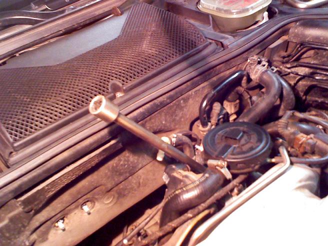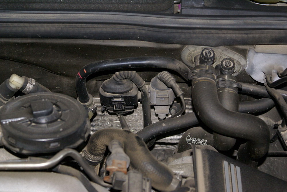 Снимаем аккуратно вакуумные шланги.Откручиваем соединительную трубку между клапанами ограничения воздуха. (см.фото)Вынуть её очень проблематично.поэтому просто отодвигаем немного ближе к двигателю.