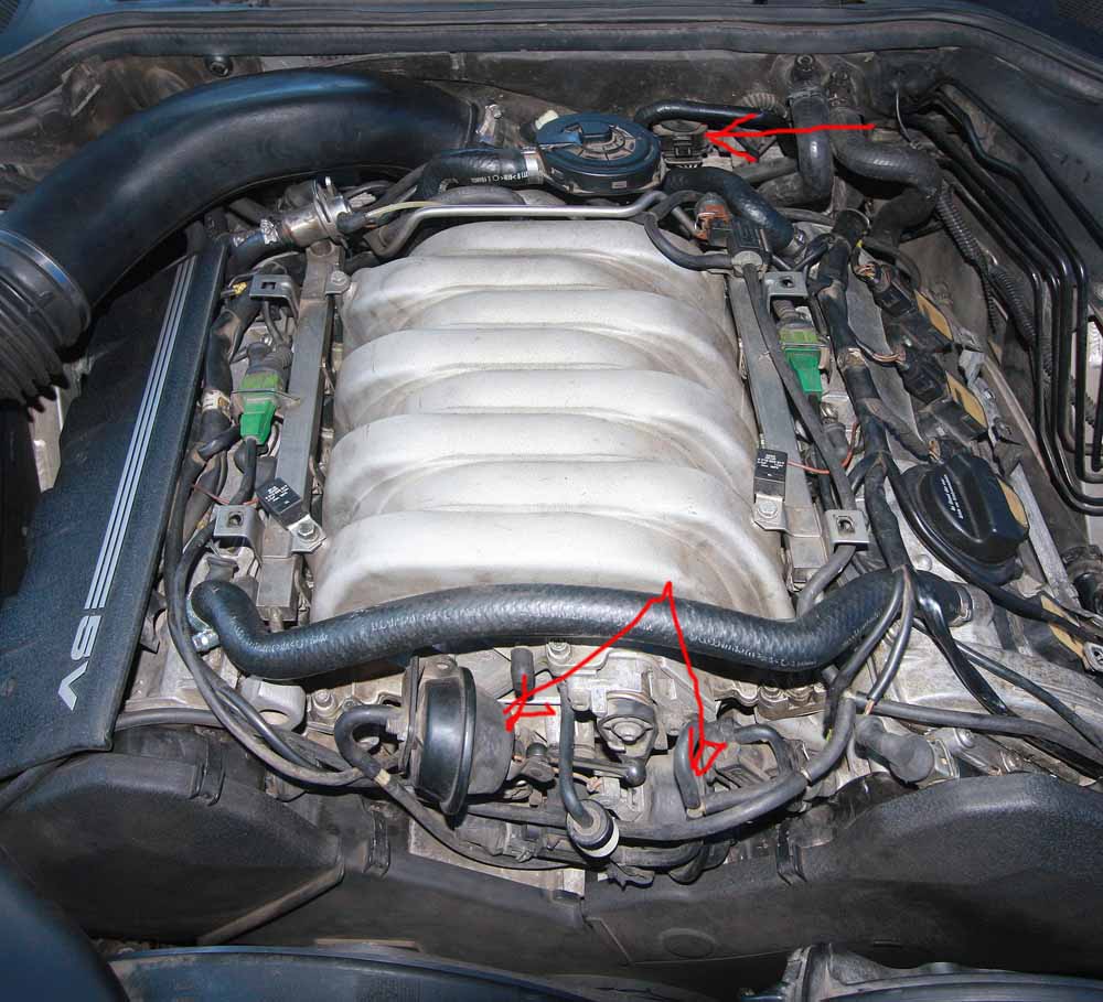 в эту штуку - верхняя стрелка - свистит и сосет воздух , зажмешь дырку наверху этой штуки - обороты немного падают . Так уже было когда-то - дырку заткнул\отпустил - прошло...