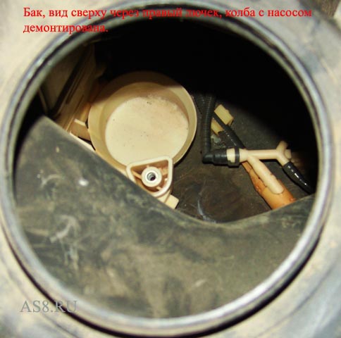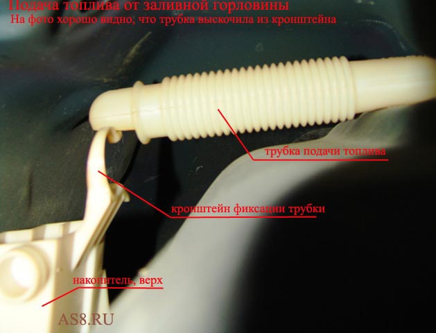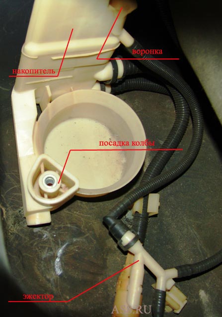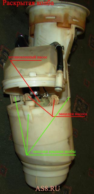 Колба с насосом вставляется в пластиковый накопитель, через специальную прокладку и привинчивается длинным болтом. Это соединение должно быть герметично, через него попадает топливо из накопителя в колбу. Заливная горловина бака расположена так, чтобы заливаемый бензин затекал в накопитель сверху. Толстые трубки правой части бака подают бензин в накопитель снизу, трубка левой части бака подает бензин в накопитель чуть выше. Через внутренние каналы в накопителе, бензин попадает в колбу. Туда же сверху подается бензин от обратки. Насос выбирает некоторое количество топлива из колбы, лишнее топливо из накопителя сливается в правую часть бака. Таким образом, поддерживается циркуляция топлива внутри бака, постоянное наполнение накопителя и колбы бензином. Даже при осушении левой заборной трубки топливо продолжает поступать справа.