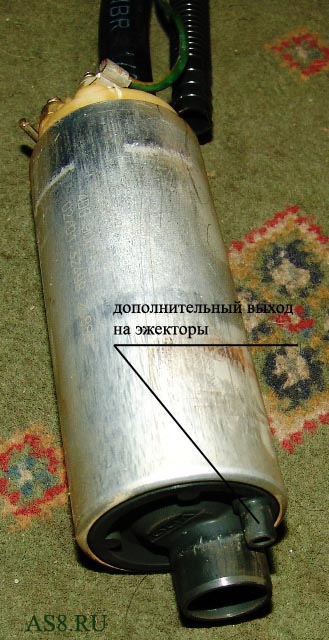 Бензобак в Ауди А8 состоит из сообщающихся частей, в правой части бака установлен накопитель, в нем в специальной колбе расположен сам бензонасос. Забор бензина происходит из колбы накопителя, в которую бензин попадает из обеих частей бака в результате работы специальной системы перекачки, через толстые трубки. Трубки заканчиваются специальными наконечниками – эжекторными насосами. Эжекторный насос - установка самовсасывающего типа, которая поднимает топливо за счет разряжения в эжекторе (используется закон Бернулли). Разряжение создается топливом, которое подается от бензонасоса через отдельный выход под высоким давлением, но с маленькой производительностью.