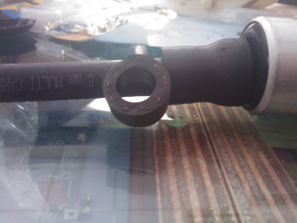 По топливу - была взята трубка от основного насоса с С-ки, дотаточно длинная по той же причине, что и провода (думаю без проблем можно взять любую подходящую бензостойкую трубку, давление там небольшое - думаю, меньше атмосферы). Один конец трубки цепляется оответственно на насос, второй - на алюминиевую трубку и зажимается (на фотке соединение для этого выделено гламурным кружком), при этом освободившуюся трубку заткнуть