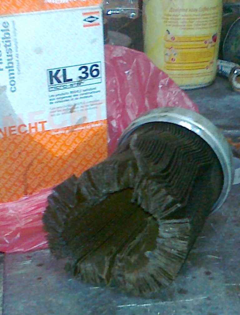 Не знаю, насколько это хорошо видно по фотографиям, но фильтр был сильно грязный. Куч песка и комков смол там конечно не было, но, тем не менее, каких-то отложений на внутренней стенке фильтра, причём только в одном месте было не мало. Так же на фотографиях хорошо заметна разница в цвете наружной и внутренней сторон самого фильтрующего элемента (длинная «гармошка), что лишний раз подтверждает степень засорения фильтра. Ну и естественно забитый фильтр – мощная помеха между насосом и форсунками, из-за чего имеем кучу неприятностей с мотором, но об это чуть позже.