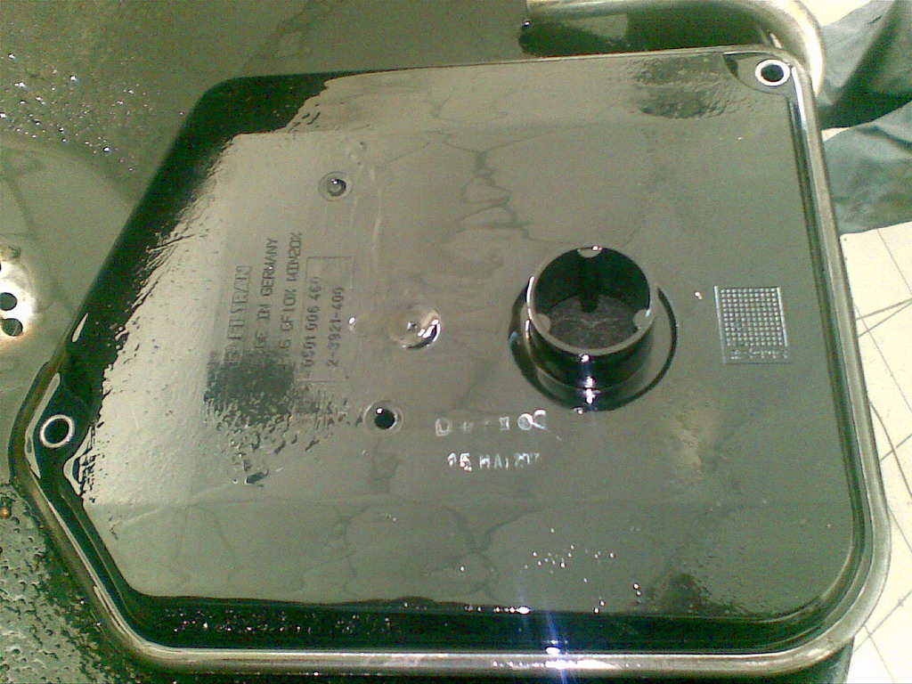 Вот что увидел внутри коробки. Как я и предполагал,немецкий хозяин ни черта в АКПП не делал,что подтверждает наличие маслянного фильтра выпуска 2002 года. Также мастер открутил вот эту нижнюю трубку,идущую в маслянный радиатор.В последствии из этой трубки выливалось грязное масло,ну а затем полилось свежее и чистое. Помыли хорошенечко поддон,почистили магниты.Поставили новую прокладку. Затем поставили новый фильтр(фотки не сделал) и при помощи динамометрического