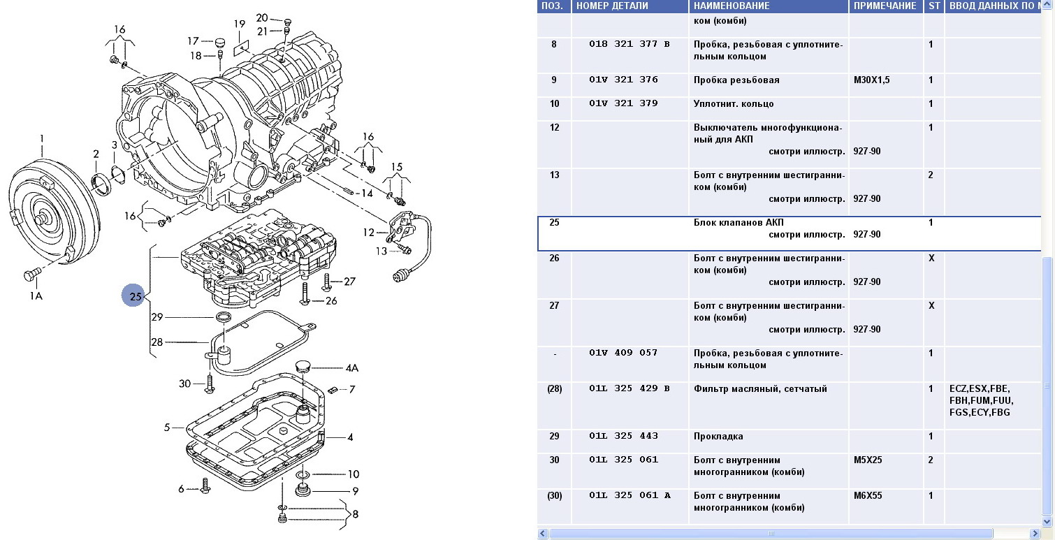 Решение проблемы. Для начала решил поменять масло, однако проблема оставалась. Было принято решение, что надо разбирать АКПП и искать причину. Когда коробка была снята и разобрана, были тщательно просмотрены все элементы, после чего особых признаков указывающих на причину удара при переходе с 5 на 4 передачу или более низшую, которая больше всего беспокоила, особенно то не было выявлено. Единственное что раз уже коробка была разобрана, то для уверенности решил восстановить гидротрансформатор символ Q35, обозначен на рис. гидротрансформатор поз.1, также были заменены все резинки и уплотнители, а также произведена замена поршня муфты заднего хода на рис. ZF 5HP24A поз.28, на рис. из программы ETKA указана муфта заднего хода с элементами - поз.5. Коробку собрал и поставил назад, поменяв фильтр и залив новое масло. Однако причина № 2 не исчезла, а по причине № 1 немного мягче стала включаться задняя передача, но не существенно. В общем, головоломка вместе с ремонтными работами и поиском причины длилась неделю. После всяческих проверок электроники и гидравлики пришла мысль по поводу неправильной работы блока клапанов, рис. из программы ETKA рис. блок клапанов поз.25. Решил его снять и перебрать, однако результата не дало. В дальнейшем поиске решения проблемы для полного исключения блока клапанов нашел б/у, но правда от авто с 98 года. Поставил этот блок клапанов и вот какая ерунда получилась: пришлось перекинуть проводку со своего блока клапанов, так как разводка на фишке отличалась от моей т.е блок клапанов до рестайла 99’ и после 99’ не взаимозаменяемы, глюки совсем другие начали проявляться, что и окончательно навело на мысль замены блока клапанов. После замены блока клапанов на новый так как б/у нельзя было найти да и рисковать не хотелось с б/у, а также вышеупомянутых работ результат был на лицо. Теперь АКПП работает просто безупречно, удары при переходе с 5 на 4 передачу или более низшую пропали, толчки при переходе на R и D также исчезли. Все передачи переключает очень плавно. Вот такая вот история
