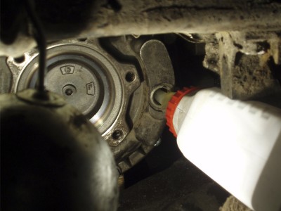 Затянув крышку достаточно крепко от руки воротком заливаем масло, пока оно не польётся из отверстия. На этот раз вся бутылка влилась без проблем, а при доливке (о которой я говорил в первом посте) масло пришлось заливать очень долго шприцем. Причиной этому наверняка был тот пластелин из стружки, пыли и масла, который собрался на обратной стороне крышки.