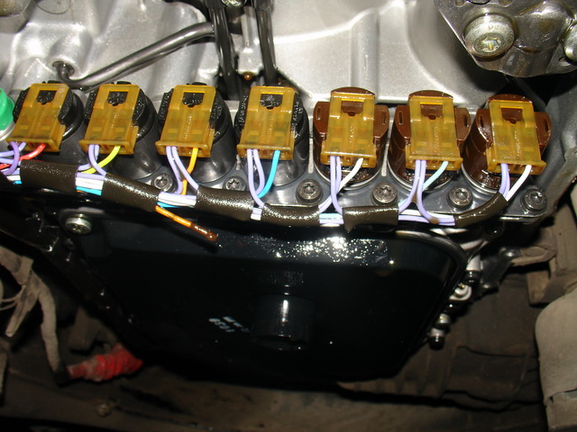 Фишки просто сниматся вниз, а сами соленоиды снимаются после того,как открутить все тем же 27 торксом планку-фиксатор.Три правых соленоида снимаются легко,а вот 5 левых с усилием,потому что они сидят на уплотнительной резинке.