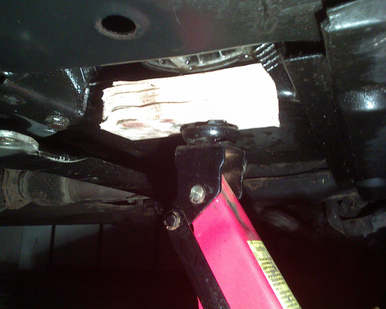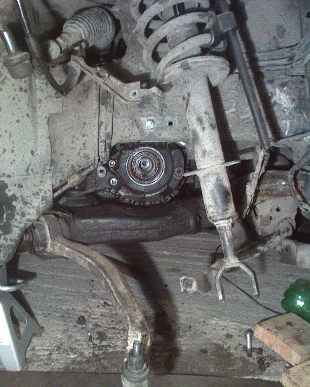 В конце концов, 3 недели назад машина была пригнана своим ходом, поставлена в гараж и поднята на стойки. Снятое колесо и внимательно обследованный больной показал, что для доступа к крышке дифа даже яма не нужна! При условии снятой справа подвески можно было смело заниматься ремонтом! Процесс снятия подвески я опущу, он изложен в других отчётах одноклубников, скажу лишь, что потребовалась стяжка для пружины, снятый поворотный кулак с суппортом (отключение датчика АБС и колодок, а также тормозного шланга обязательно) и снятые нижние рычаги. Верхние процессу не мешают, а наоборот, способствуют - на них очень удобно вешать переноску.