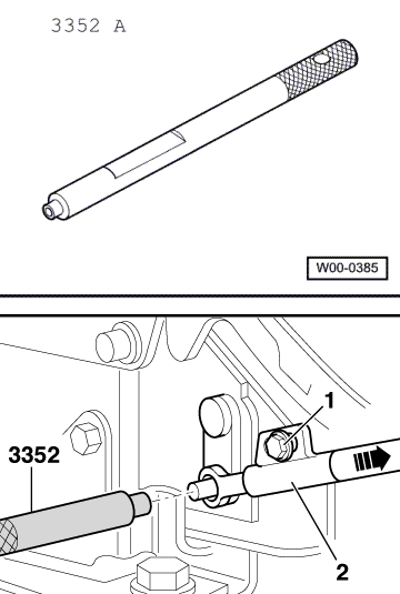 – Вставить регулировочный калибр для блокирующей тяги -3352 A- между пальцем на рычаге блокирующей тяги и ушком блокирующей тяги.