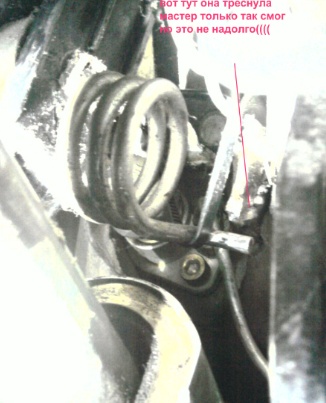 объясню как могу ,на конце педали есть пружина она крепиться в кольцо, и оно поломалось (из за этого цепляла рулевой вал и руль гудел)пружина просто висит (с левой стороны держится а с правой на воздухе) аргоном не подобраться мастера говорят. а как еше не пойму??