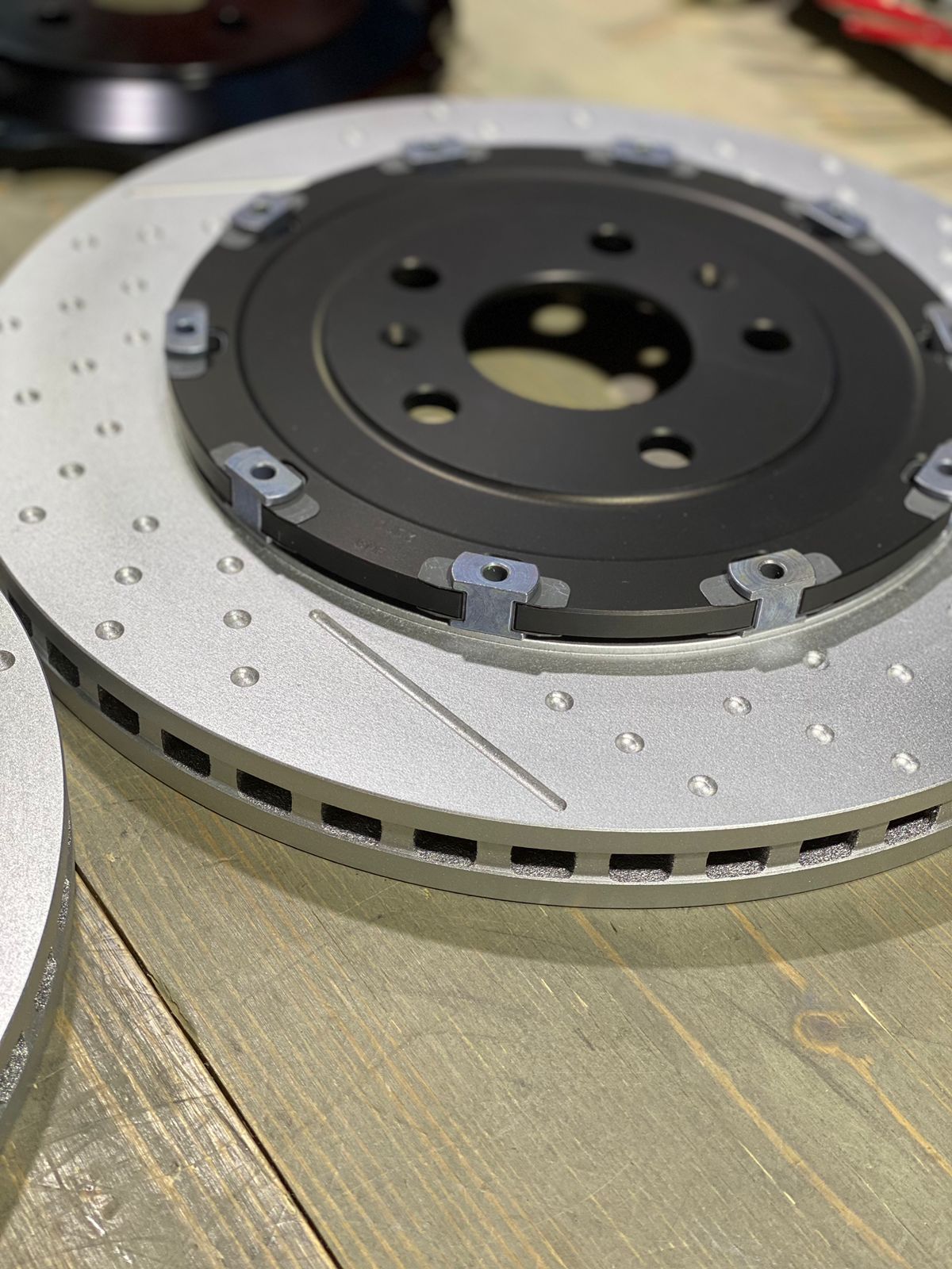 - Диски тормозные RS6 C6 оригинальный номер - 4F0615601H, но у меня будут сборные диски от Антона Прома, центра алюминий по его чертежам, роторы его производства, чугун, насечки, перфорация не сквозная, чтобы трещин не появлялось, охлаждение реберное, направленное, т.е. внешне диски будут как мои передние, их делал тоже Антон, но там у меня роторы Брембо.