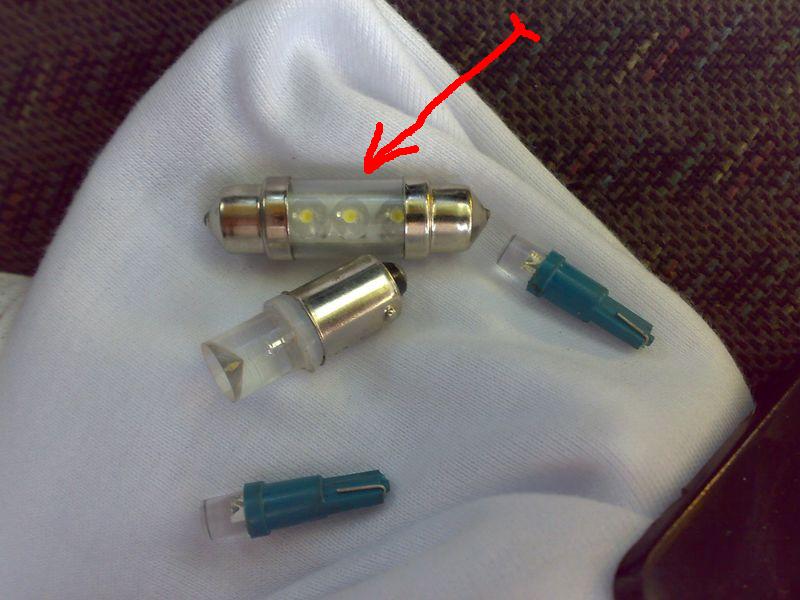 Пошел на базар,зашел в ряды где торгуют разной всячиной для отечественного автопрома. Там увидел эти лампочки.По три диодика в длинной лампочке.Под заднее сидение другого типа диоды. Завтра сфотографирую лампочки и выложу фотки. Нет у них названия и маркировки. Рынок колхозный,значит лапочки колхозные