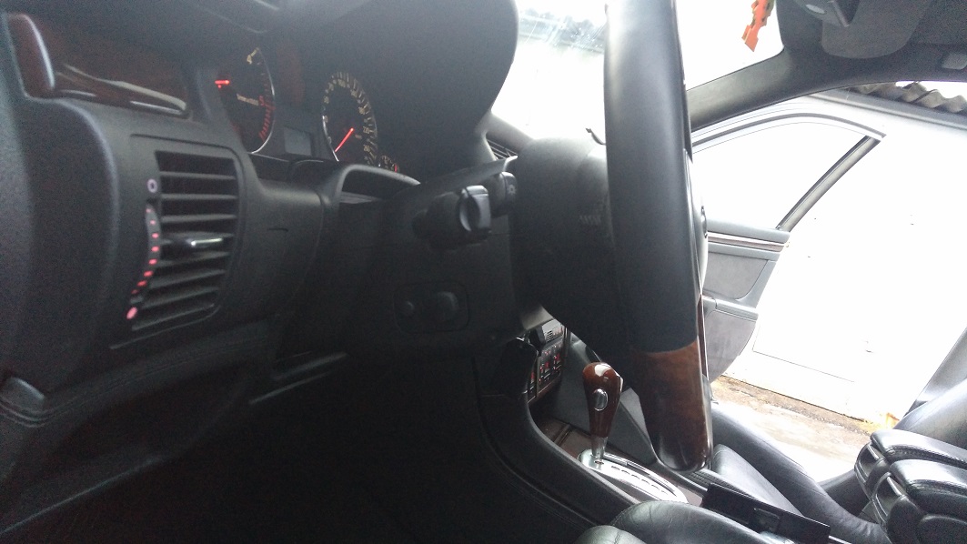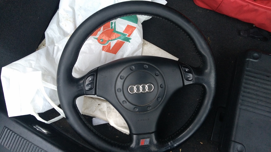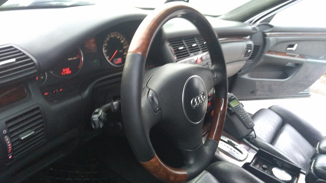 После замены ручкм АКПП назрел вопрос искать руль с деревом под ту же текстуру что и весь салон .Оригинальный руль 3 спицы у ауди в дереве только один заводской .Это полностью в дереве без типтроника .Отказаться от кнопок типтроника я не мог . И вот решил переделать свой в ателье и узнав ценник что за такой руль придется выложить 400 эвро, сразу понял что это не вариант . И тут мне попадается тема с рулями . И вот я вижу что то похожее что мне нужно .Вообщем ждал я его в общей сложности 3 мес. Сначало пришел руль без подушки, потом уж и подушка пришла.Руль сделан в Германии в ателье очень качественно . Пришлось перетянуть освежить кожу так уже был не новым . Дерево тоже не идеально кое где есть трещинка в лаке . Как всегда спасибо большое Косте Trems за помощь в осуществлении проекта ! Радости нет предела, всегда нравились рули с деревом, такую баранку всегда хочется держать в руках !