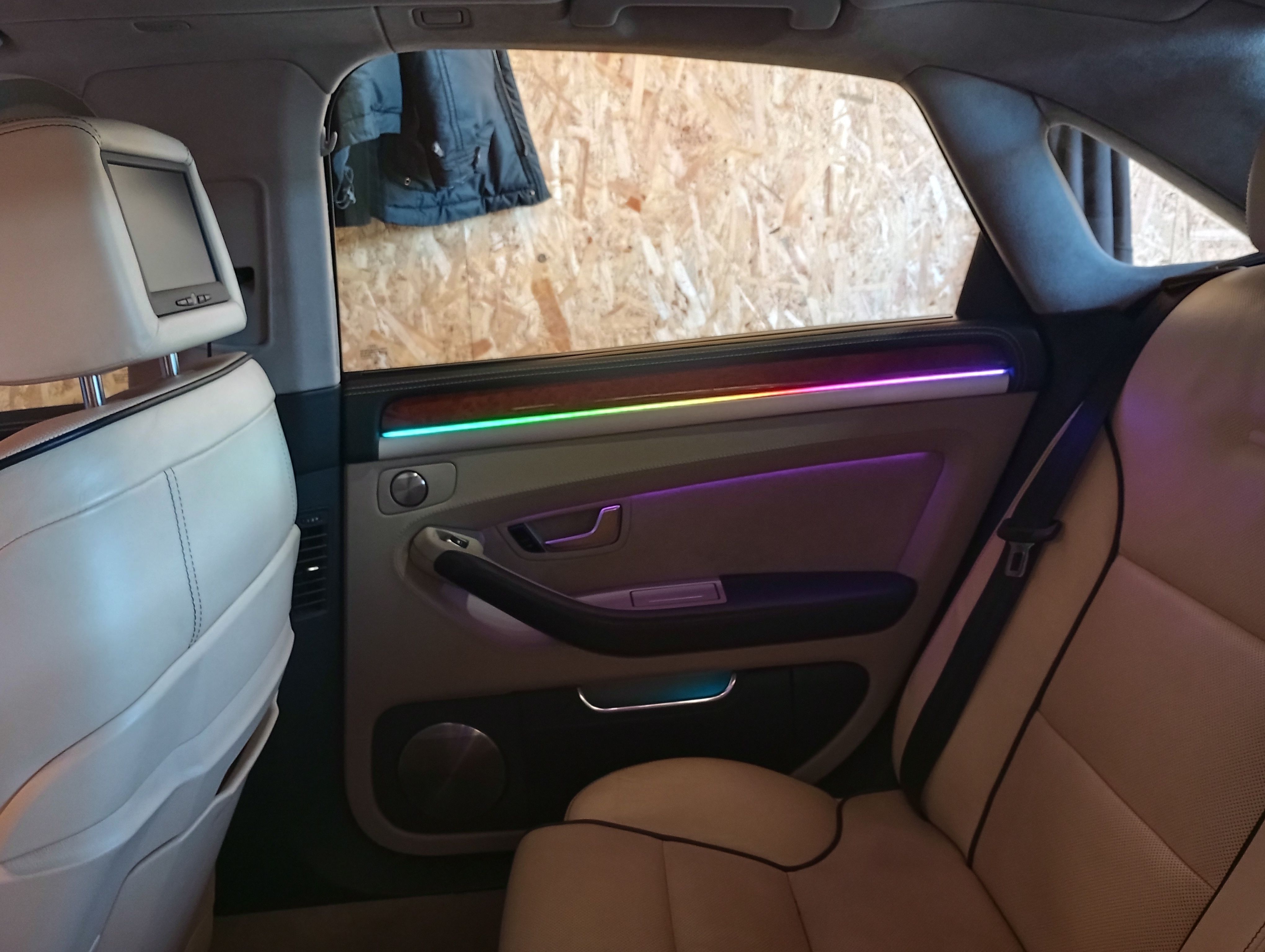 Всем категорический привет! Исследуя современные автомобили, обнаружил у них наличие контурной подсветки, которая не стояла в одном ряду с Ауди А8Д3,решил дооборудовать чем-то похожим. Сразу оговорюсь, фото вообще никак не передают реальных зрительных эффектов, а так- эффект просто бомбический.Делал долго, пришлось половинить все верхние вставки в двери (чтобы сделать щель). Но и тут ждала неудача - лента гнётся только в одну сторону, решил ставить её не поперёк, а вдоль.. Пришлось пилить дерево (жалко). Ну и в итоге..