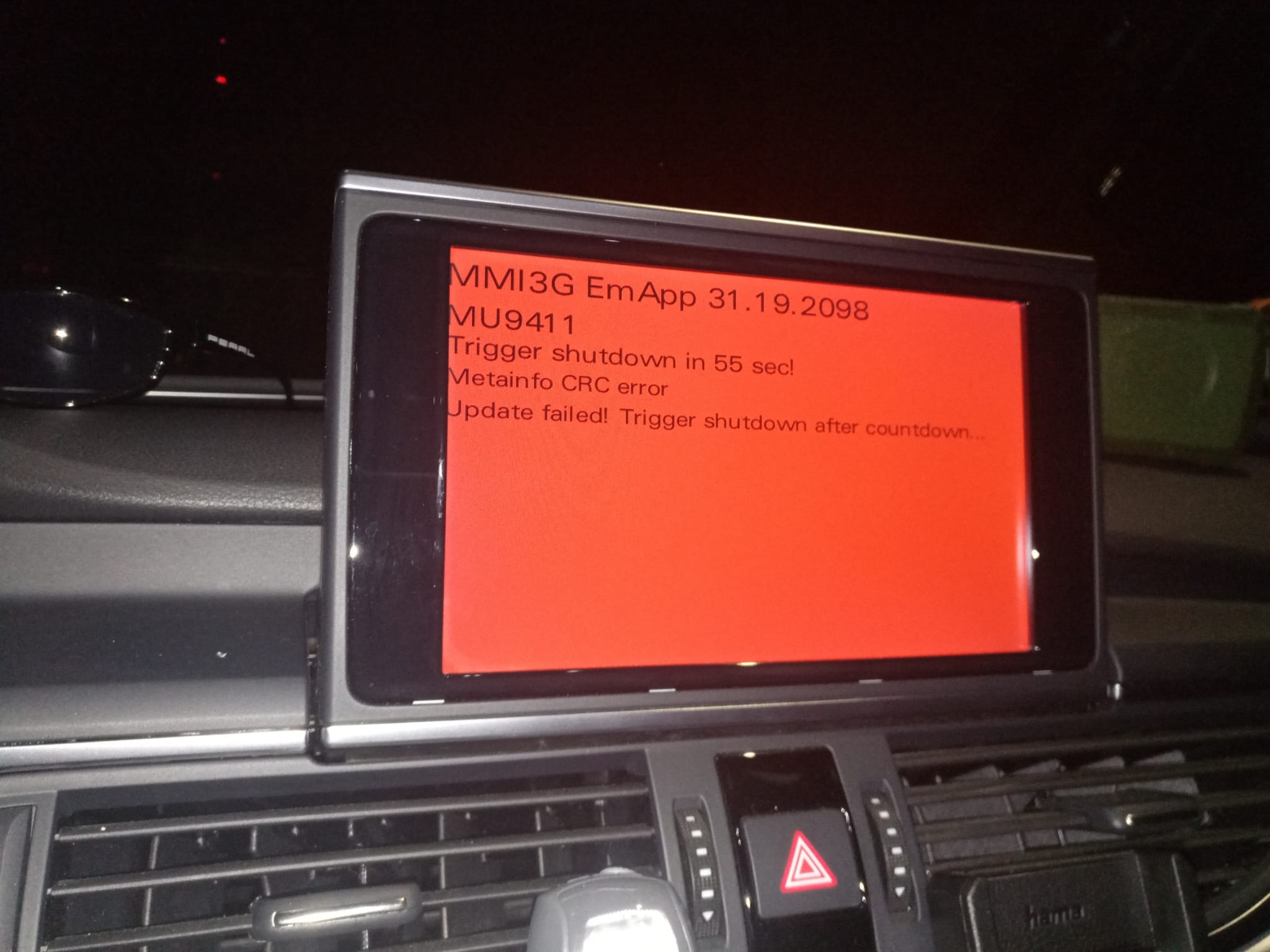 Залил на другую карточку ту прошивку, на который обновление сбилось. Сунул в MMI, пошел поиск файлов ( экран стал зеленым), после сканирования файлов обновление пошло дальше.