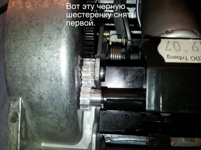 14. Важно: Вынимаем (продавливая, не смотря на стопор), большую часть лифт механизма по часовой стрелке. Я поддевал меньшую часть механизма, что бы под ним прошла большая со стопором. (помогите обозвать механизмы). Теперь путь к шестерням главного привода свободен.